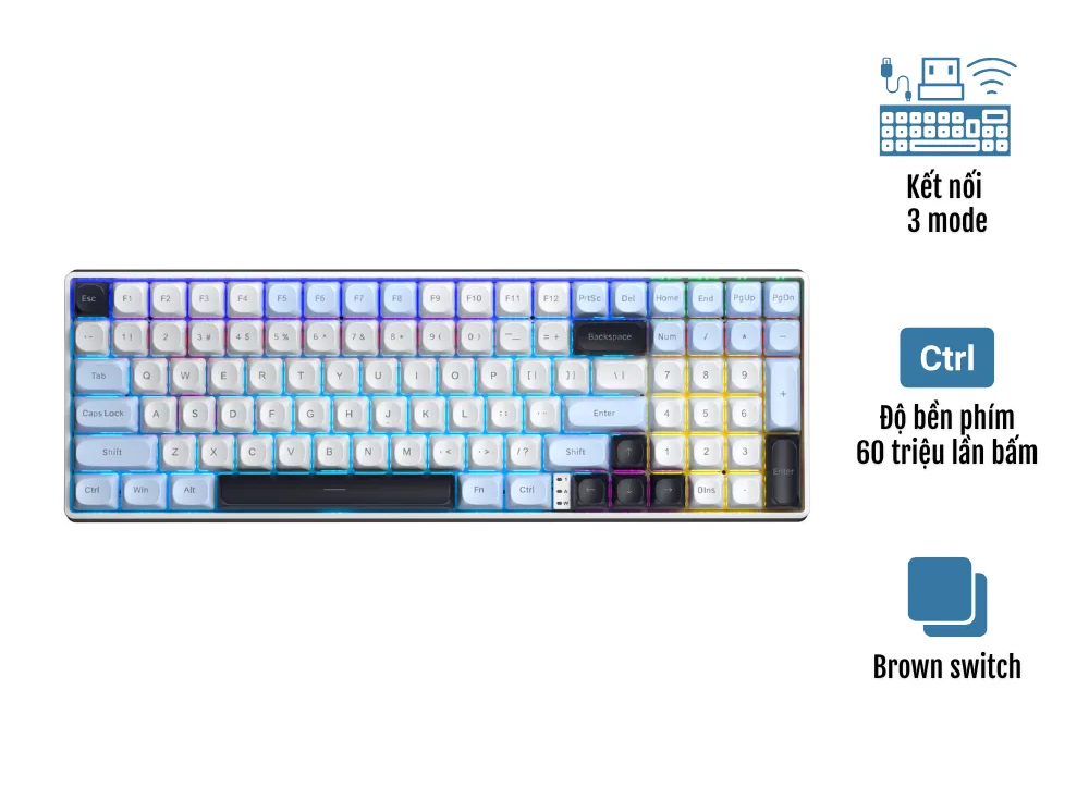 Bàn phím được trang bị switch brown chất lượng cao với độ bền lên đến 60 triệu lần bấm, đảm bảo khả năng hoạt động bền bỉ trong thời gian dài. Điều này phù hợp với các game thủ thường xuyên sử dụng bàn phím liên tục và yêu cầu tính ổn định cao trong từng lần gõ phím.