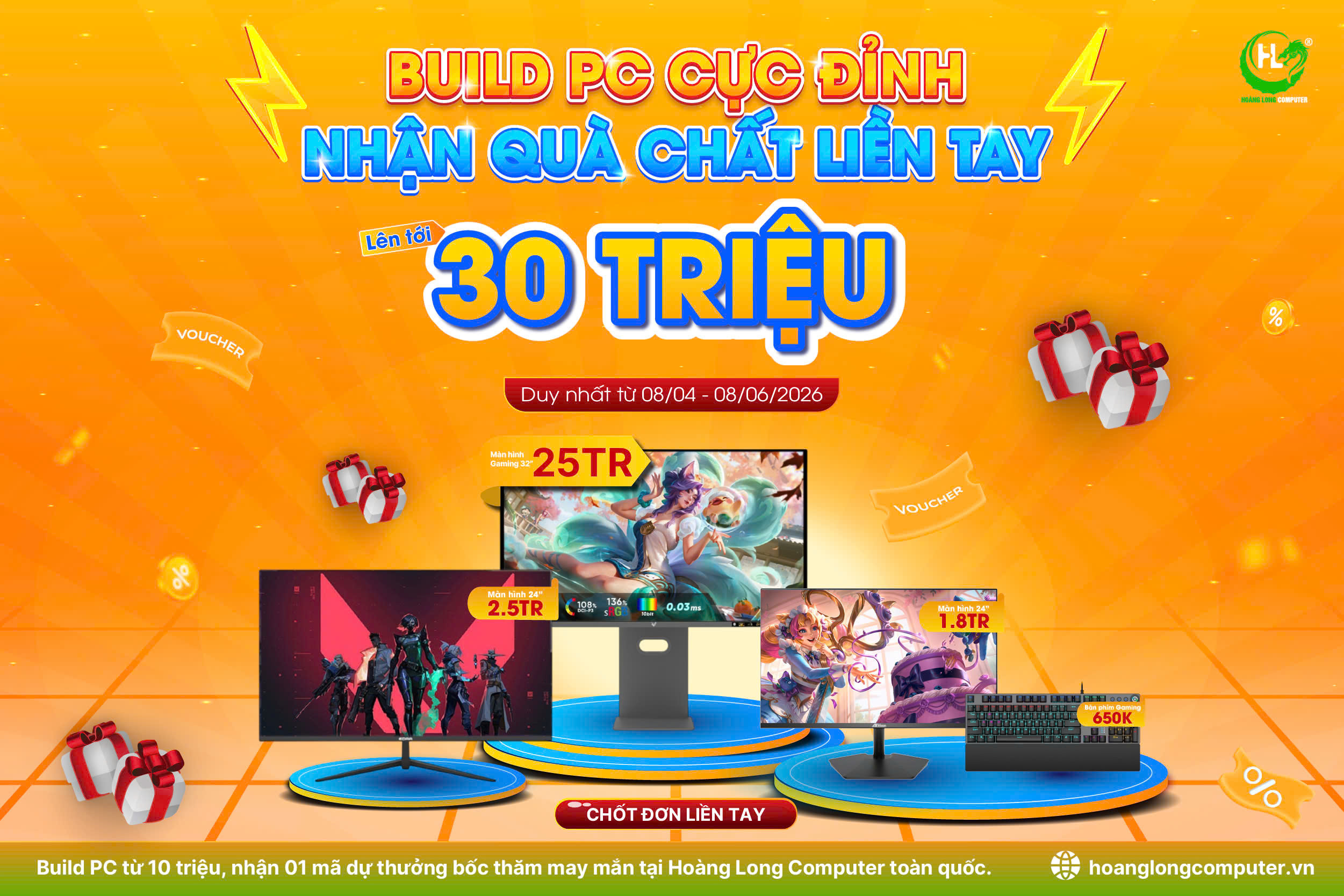 DUY NHẤT từ 08/04/2026 đến hết ngày 08/06/2026, khi Build PC với hóa đơn từ 10.000.000 VNĐ trở lên tại hệ thống cửa hàng Hoàng Long Computer trên toàn quốc, bạn sẽ nhận ngay 01 mã dự thưởng để tham gia chương trình bốc thăm may mắn!