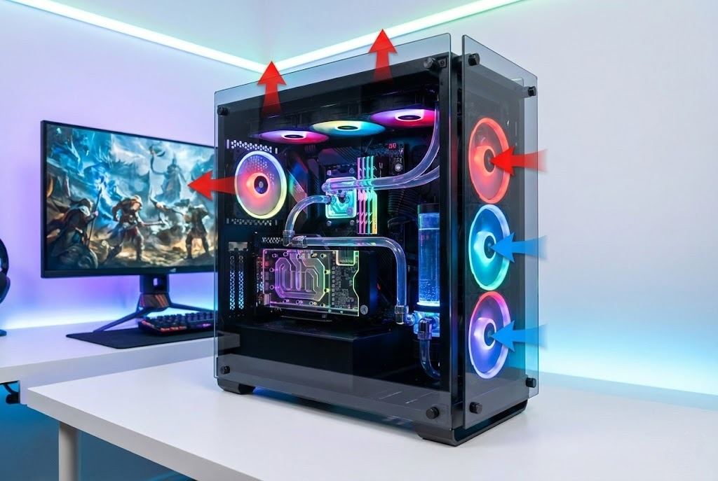 Với thiết kế kính bao phủ, việc tối ưu luồng khí (airflow) được Hoàng Long Computer đặc biệt chú trọng. Hệ thống tản nhiệt nước AIO kết hợp cùng các quạt hút xả ngược giúp luồng khí nóng được đẩy ra ngoài liên tục. Điều này cực kỳ quan trọng đối với PC Gaming, giúp CPU và GPU luôn mát mẻ ngay cả khi "cày" game liên tục trong nhiều giờ đồng hồ.