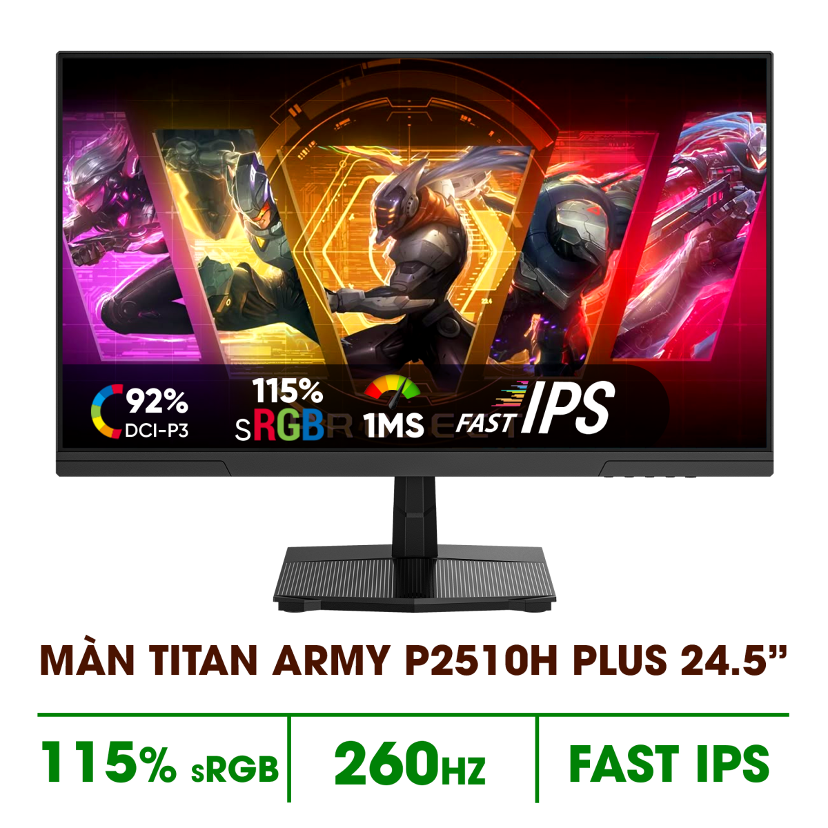 MÀN HÌNH TITAN ARMY P2510H PLUS (24.5 inch/ FHD/ 260Hz/ Fast IPS/ 1ms/ Phẳng) là lựa chọn hoàn hảo cho những game thủ đòi hỏi tốc độ hiển thị mượt mà, độ trễ thấp và màu sắc chân thực. Với thiết kế màn hình phẳng 24.5 inch, độ phân giải Full HD cùng tần số quét lên tới 260Hz, sản phẩm này mang đến trải nghiệm gaming vượt trội so với các màn hình truyền thống.