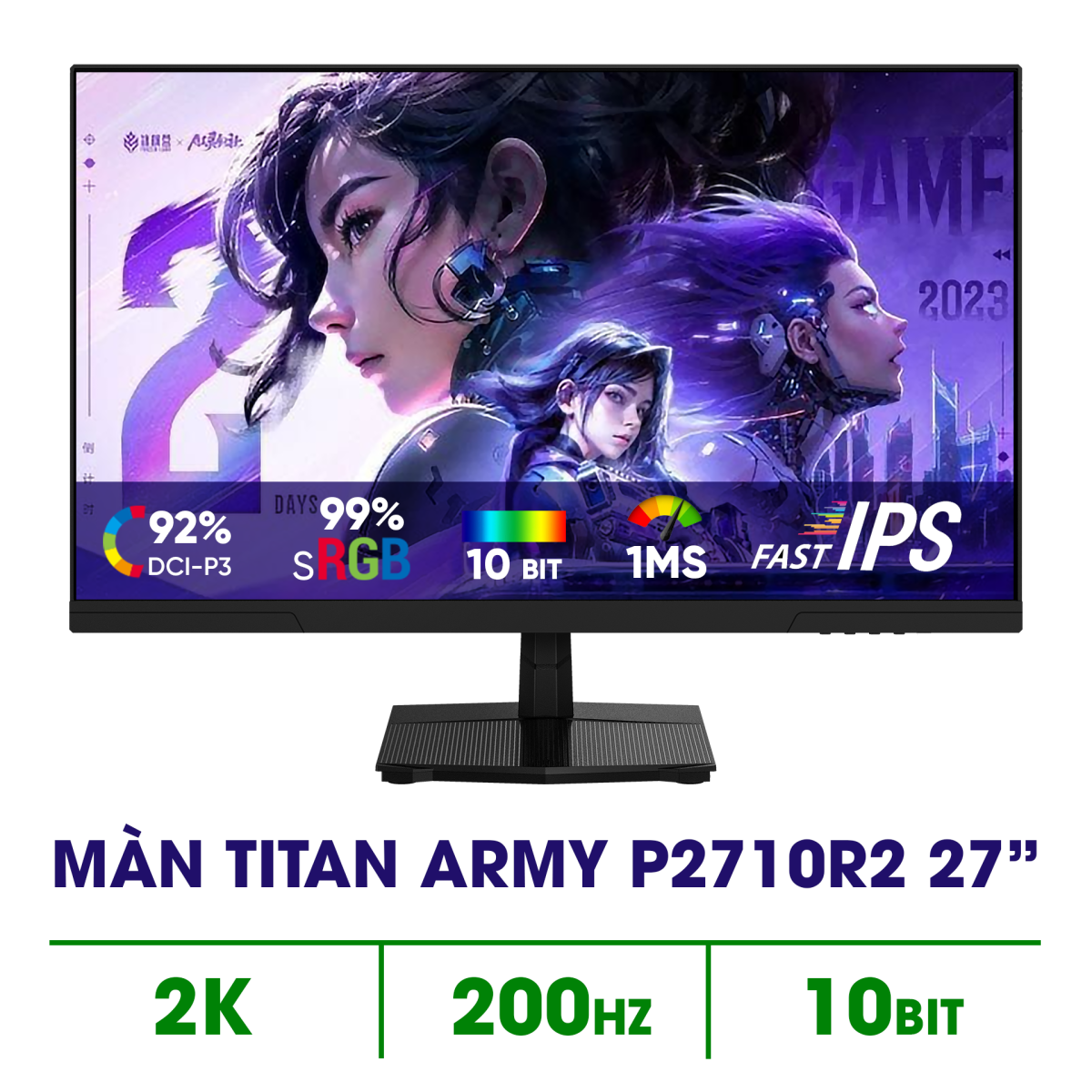 MÀN HÌNH TITAN ARMY P2710R2 là chiếc màn hình gaming 2K không đối thủ trong phân khúc. Sự kết hợp giữa độ sắc nét 2K và tốc độ đỉnh cao 200Hz FAST IPS 1MS mang lại một trải nghiệm chơi game vượt trội – vừa siêu nét, vừa siêu mượt. Nếu bạn muốn nâng cấp góc gaming của mình lên chuẩn mực chuyên nghiệp mới, P2710R2 chính là lựa chọn hoàn hảo.