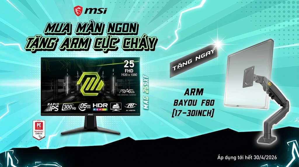 Đây chính là điểm "cháy" nhất trong đợt khuyến mãi này tại Hoàng Long Computer. Khi chốt đơn màn hình MSI MAG 255XF, bạn sẽ được TẶNG NGAY ARM NORTH BAYOU F80.